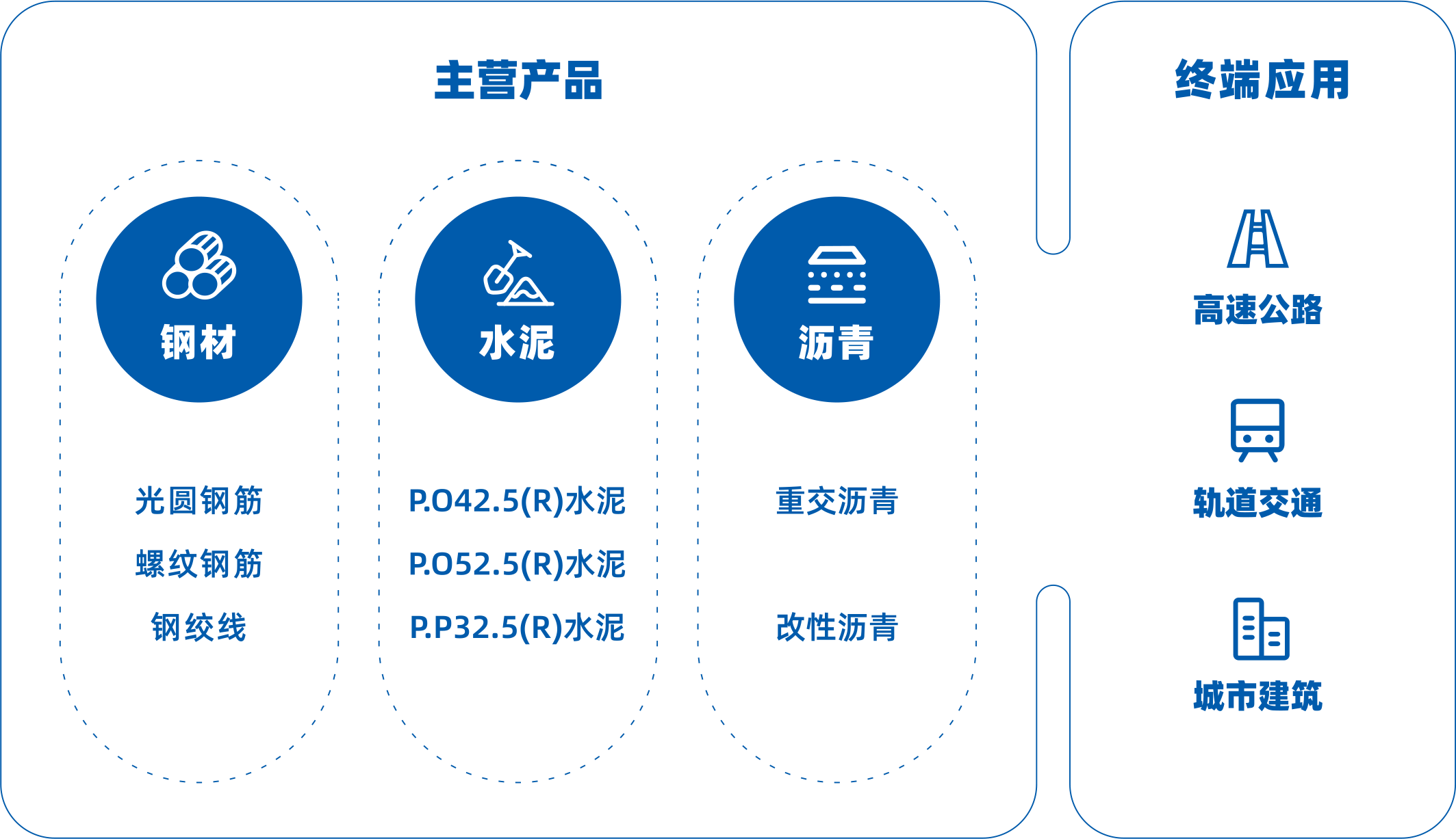 主营产品,钢筋、水泥、沥青,主要用于高速公路项目建设,连续多年获得广东省高速公路材料供应商AA资质。