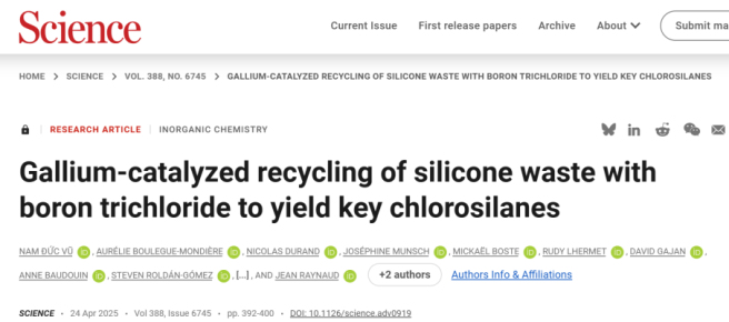 该文章首次揭示在接近室温的40℃环境下,利用高效镓催化剂实现废旧有机硅回收过程反应速率提升百万倍。借助这一创新技术,可将有机硅废料转化为氯硅烷原料,从而可以从几乎任何类型的有机硅废料中生产高纯度的回收材料。这一研究成果受到全球有机硅领域极大关注。