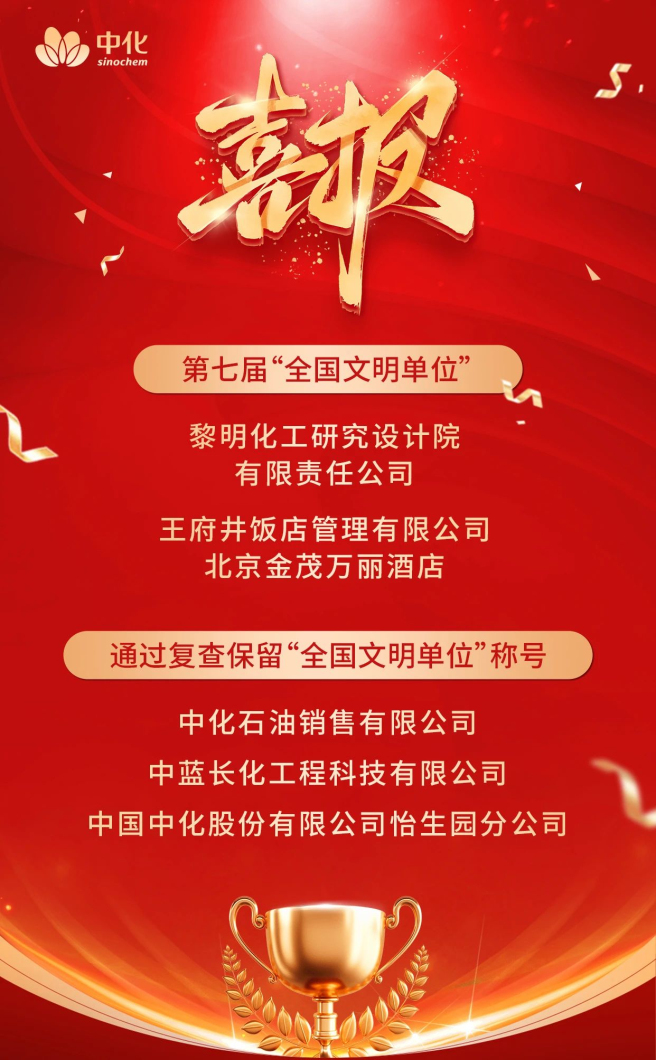 中国中化所属黎明化工研究设计院有限责任公司、王府井饭店管理有限公司北京金茂万丽酒店被授予第七届“全国文明单位”称号;中化石油销售有限公司、中蓝长化工程科技有限公司、中国中化股份有限公司怡生园分公司3家单位经复查确认,继续保留“全国文明单位”称号。